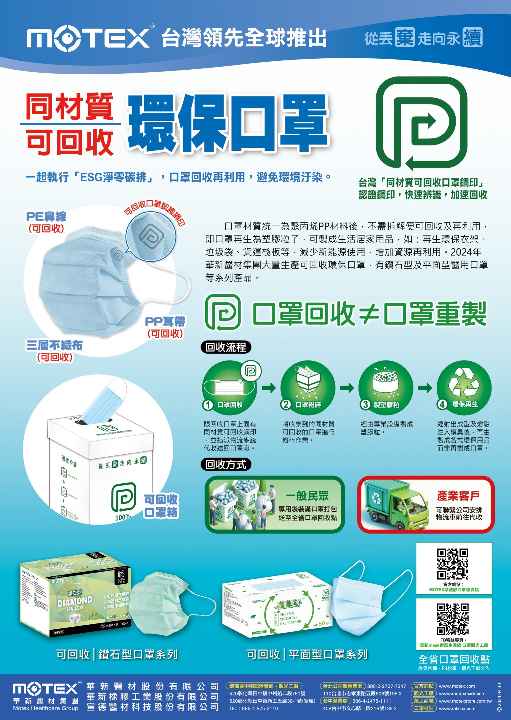 華新醫材集團適逢50週年,華新醫材集團為響應淨零碳排願景,力推永續技術融入自家產品設計當中,配合紡研所2023年領先全球建立「同材質可回收不織布口罩標準及標章」制度,在材料上與制度完成統一,統一將產品材料更改為材質聚丙烯(PP)不織布、(PP)耳帶和(PE)鼻線,期盼透過推出的回收環保口罩、回收再生系統,將口罩回收轉化再生為塑膠粒子,然後利用於製造其他生活和工業用品,如:口罩收納盒、衣架及塑膠棧板...等,不但減少對新資源的依賴,更大幅減少碳排放量。