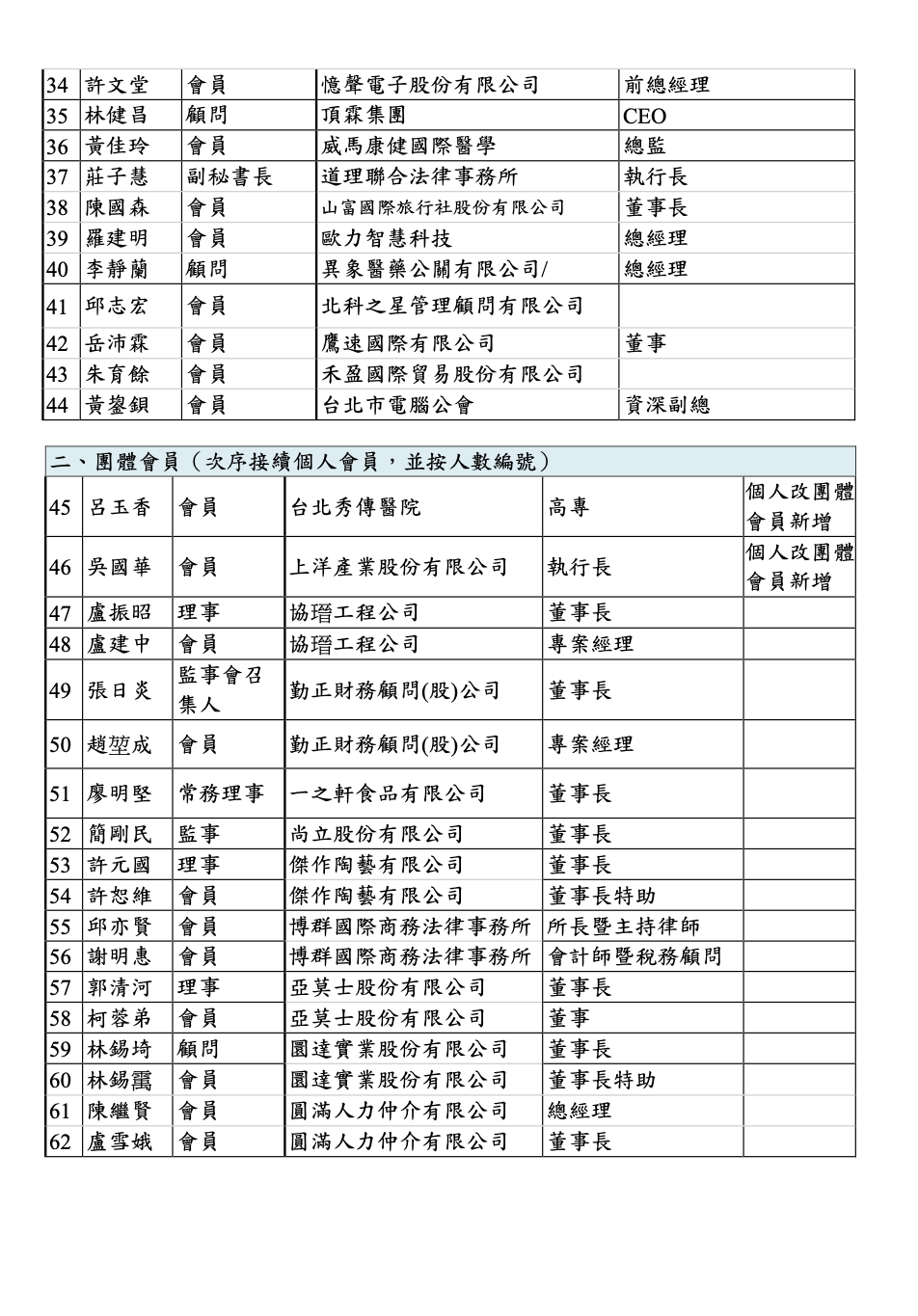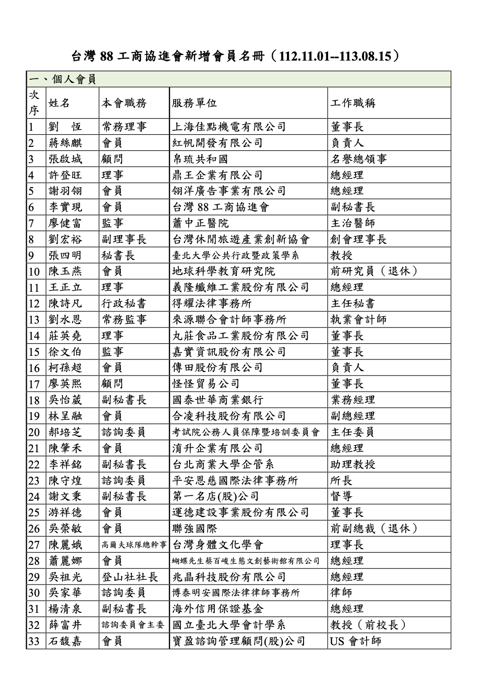 自112年11月起,廣邀各界企業家與社會菁英加入台灣88工商協進會,新增會員包括劉恆董事長等62位(資料詳如附表,第二部分為團體會員),本會會員招募成果至為豐碩,顯見社會各界對於本會理念之認同。